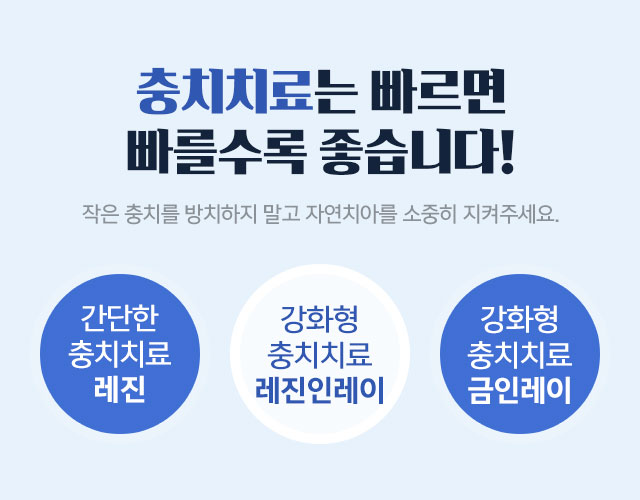 하지만 치아는 감염속도가 빠르고 치근이나 잇몸으로 염증이 옮아 더 큰 질환을 일으킬 수 있어 작은 충치라도 조기에 치료하는 것이 좋습니다.